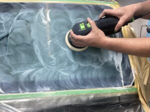 特殊なガラス用コンパウンドを使用して電動ポリッシャーで磨き研磨を
