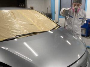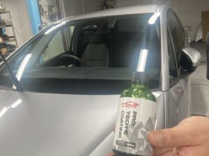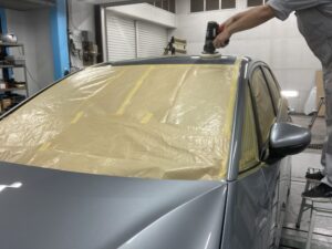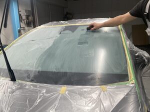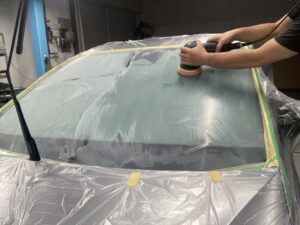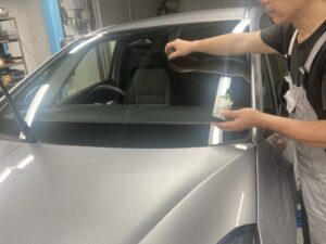 フロントガラスの撥水コーティング施工作業は新車でも下処理として